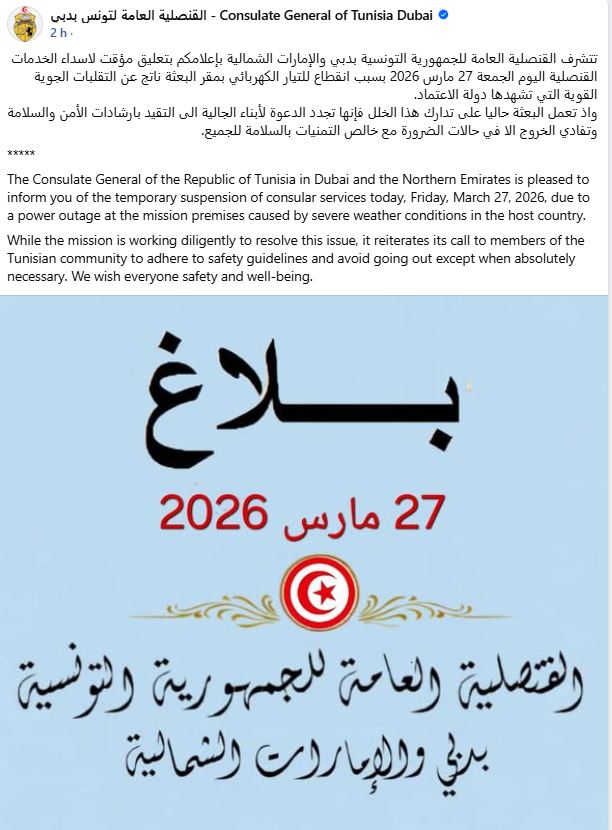 Le Consulat général de la République tunisienne à Dubaï et dans les Emirats du Nord a annoncé la suspension temporaire des services consulaires aujourd’hui, vendredi 27 mars 2026, en raison d’une panne d’électricité au siège de la mission.